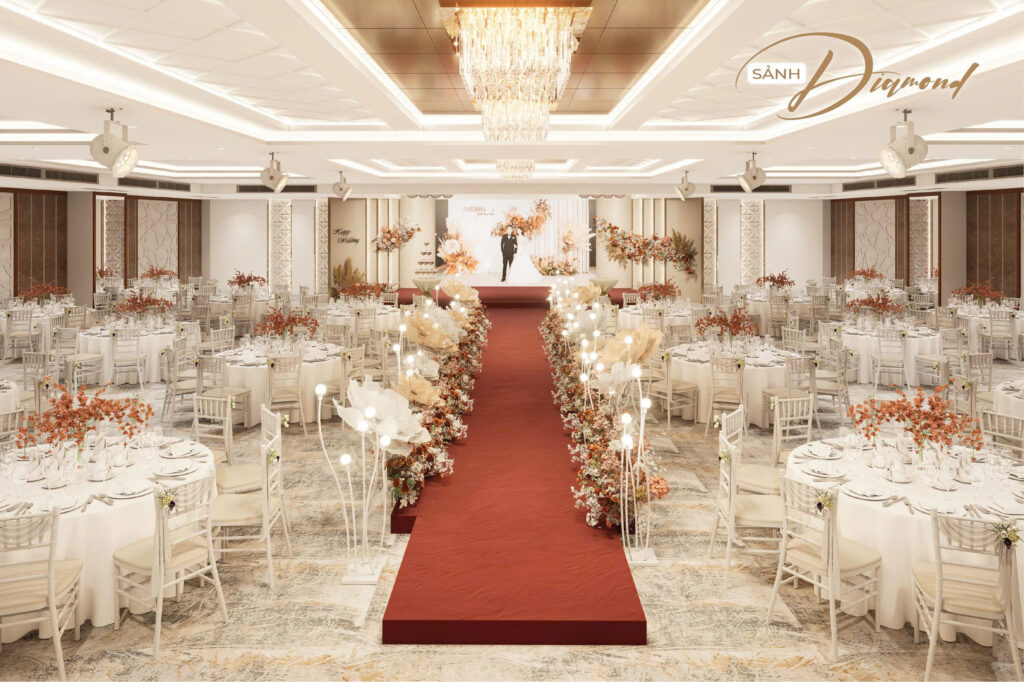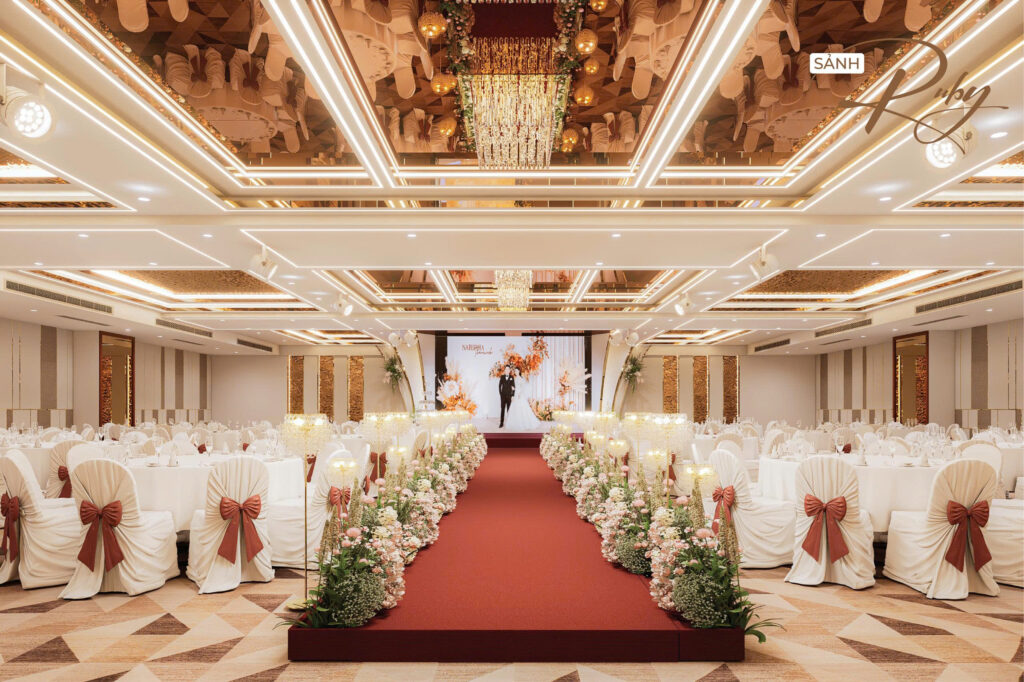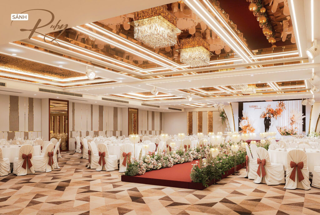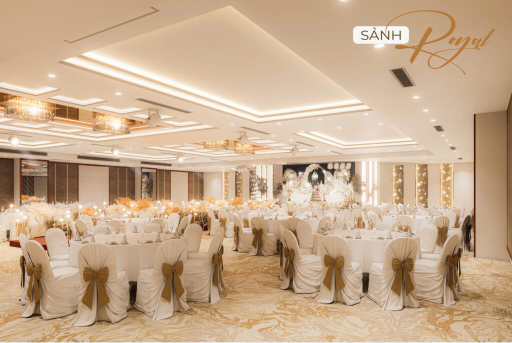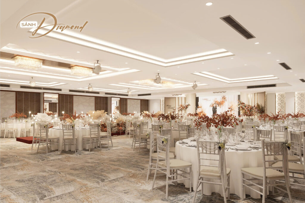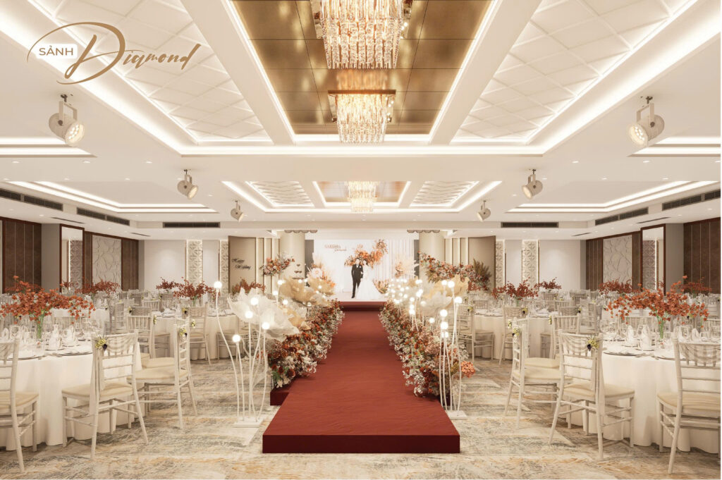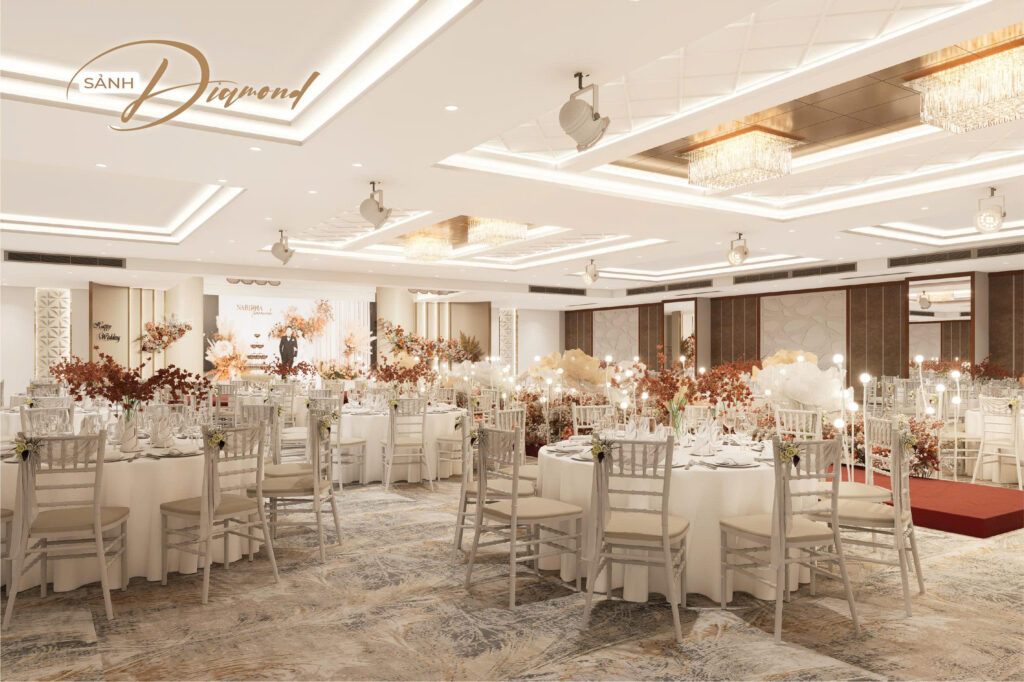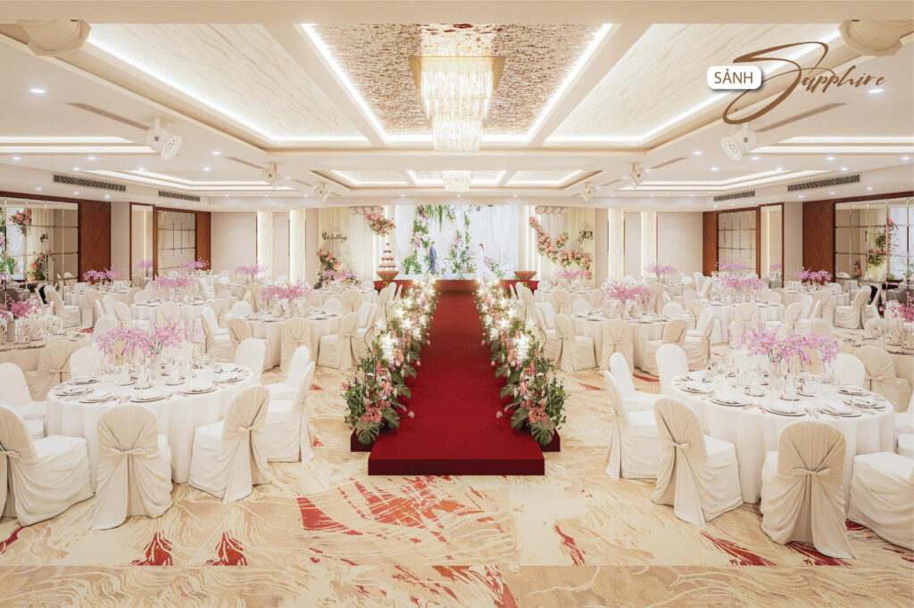 Nhằm hướng đến sự phục vụ HOÀN MỸ hơn dành cho Khách hàng. Những thực đơn đa dạng, không gian lộng lẫy – sang trọng cùng với các dịch vụ hoàn hảo… sẽ mang đến cho quý Khách hàng một sự kiện ấm cúng, sang trọng nhiều ý nghĩa. Với các chùm đèn pha lê được thiết kế sang trọng, mỗi sảnh đều có một sảnh đón khách riêng biệt.