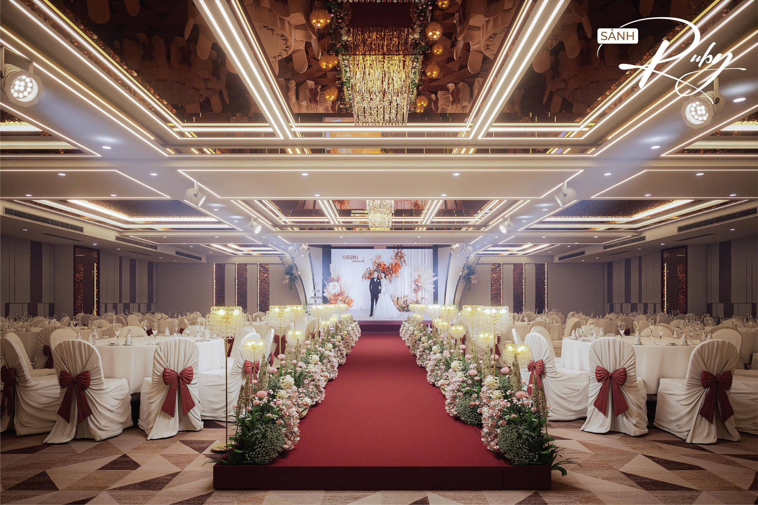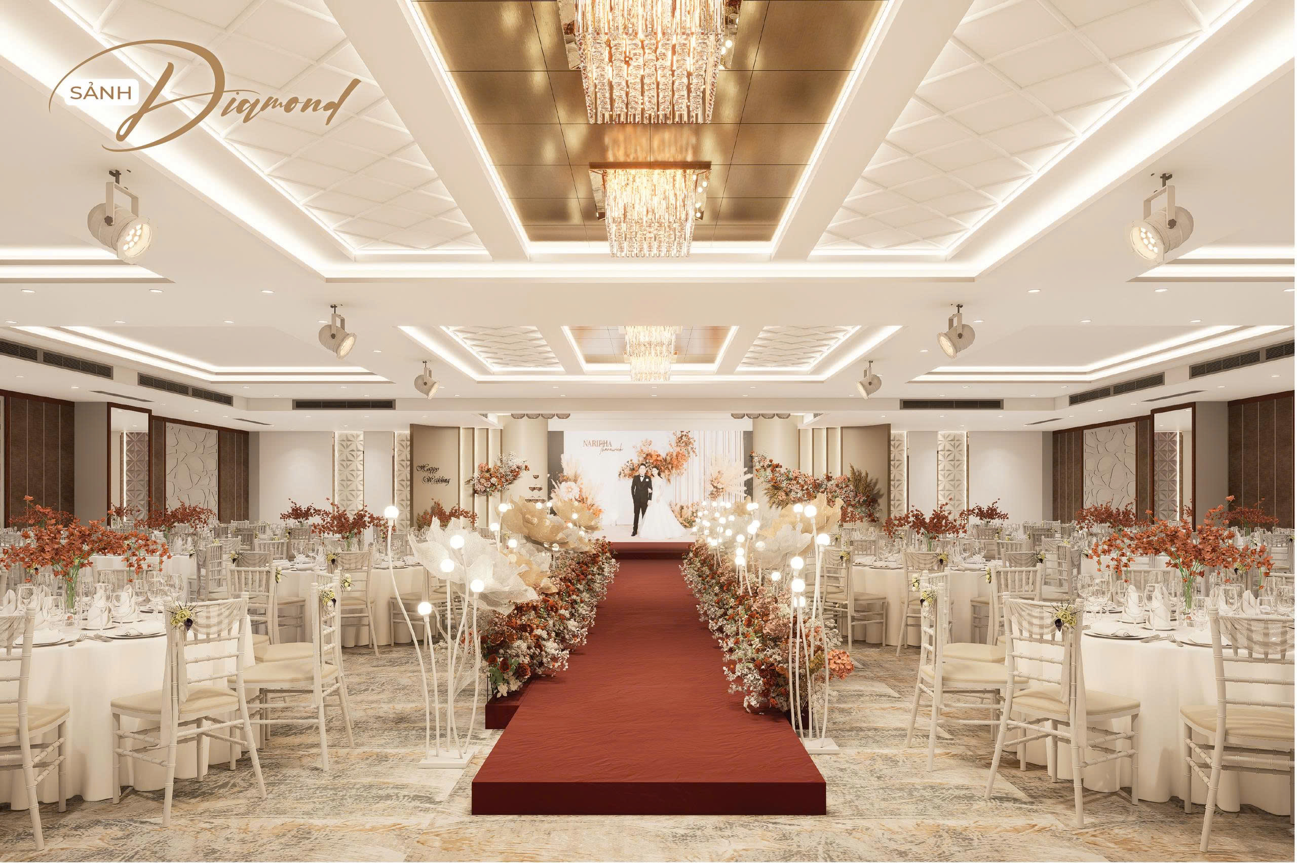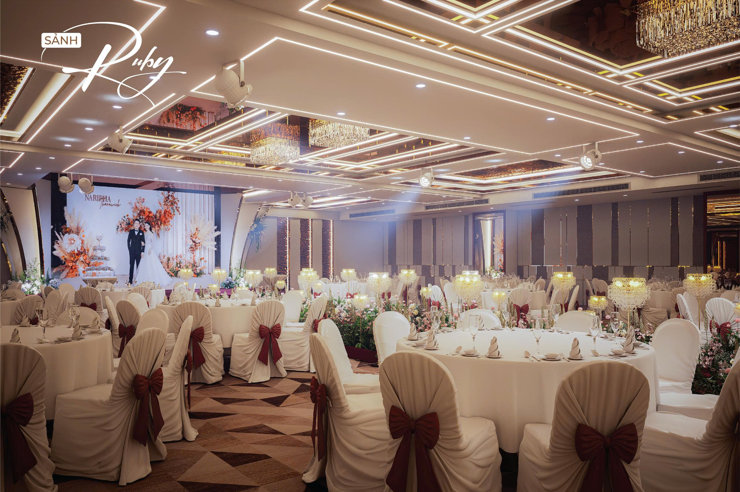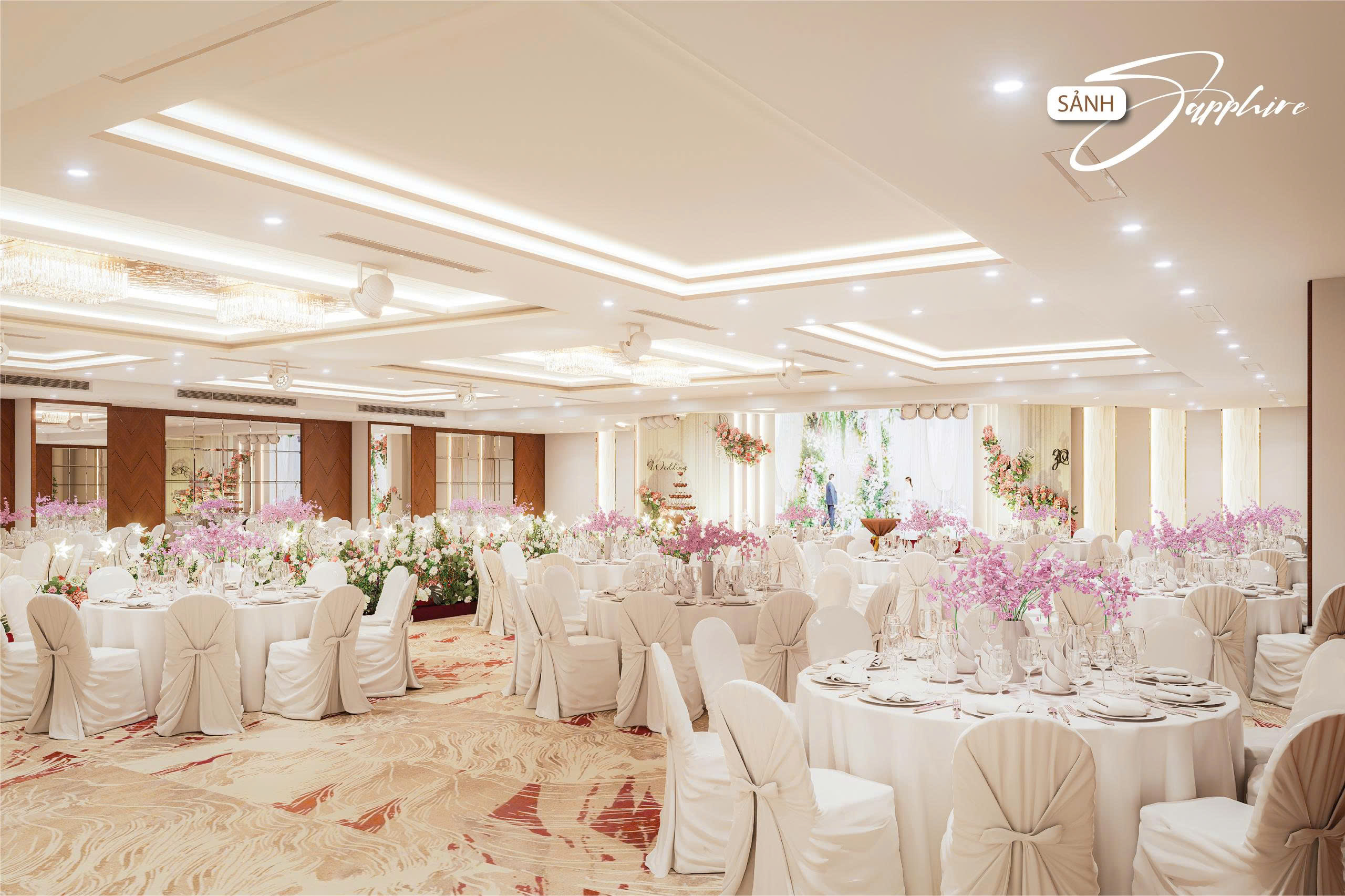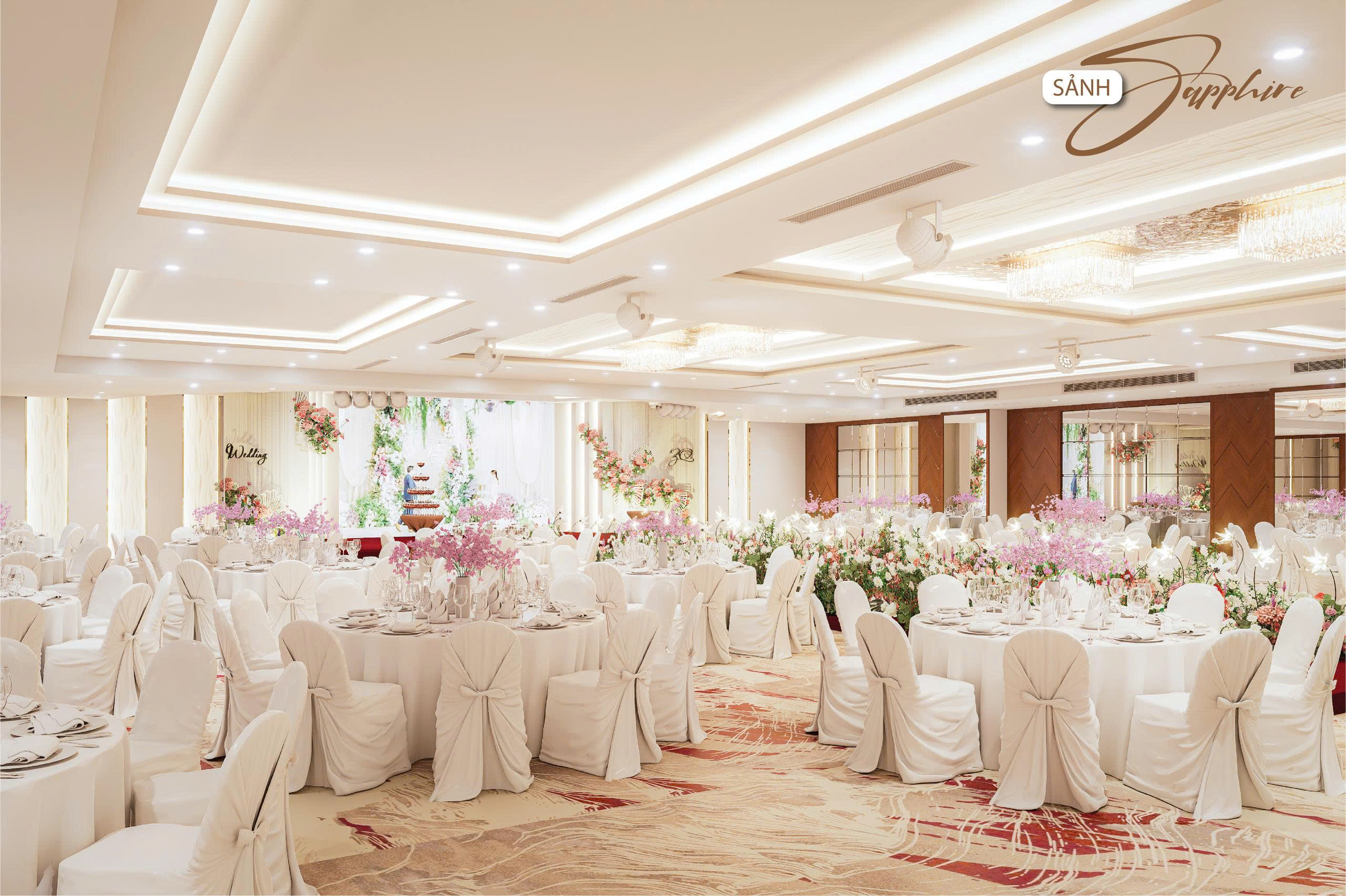 Nhằm hướng đến sự phục vụ HOÀN MỸ hơn dành cho Khách hàng. Những thực đơn đa dạng, không gian lộng lẫy – sang trọng cùng với các dịch vụ hoàn hảo… sẽ mang đến cho quý Khách hàng một sự kiện ấm cúng, sang trọng nhiều ý nghĩa. Với các chùm đèn pha lê được thiết kế sang trọng, mỗi sảnh đều có một sảnh đón khách riêng biệt.